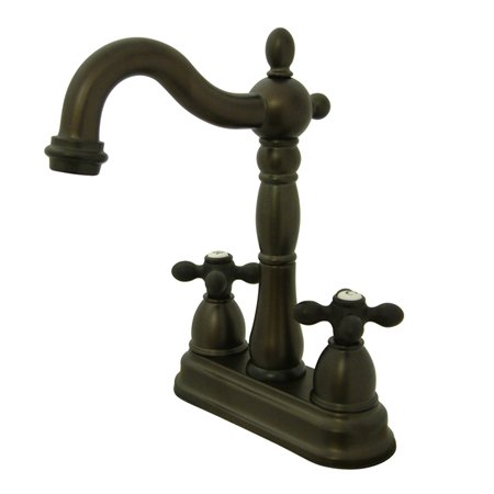 Kingston Brass KB1493AX Heritage Bar Faucet without Pop-Up Rod, Vintage BrassTwo Handle Deck Mount, 2 Hole Sink Application, 4" Centerset, Fabricated from solid brass material for durability and reliability, Premium color finish resist tarnishing and corrosion, 1/4 turn On/Off water control mechanism, 1/2" - 14 NPS male threaded inlets, duraseal washerless valve, 2.2 GPM (8.3 LPM) Max at 60 PSI, Integrated removable aerator, 4-3/4" spout reach from faucet body, 9" overall height, Ten Year Limited Warranty to the original consumer to be free from defects in material and finish.Kingston Brass KB1493AX Heritage Bar Faucet without Pop-Up Rod, Vintage Brass Features:; Brass Construction; 2.0 GPM / 7.6 LPM @ 60 psi; 4" center faucet holes; 4 3/4 " spout reach; 9" spout height; 6" spout clearance; 1/2" IPS inlet; 1/4 turn valves; Washerless cartridge; Vintage Brass Finish; Porcelain Lever Handle; Matching Pop-up Included* Image shown may vary by color, finish, or material