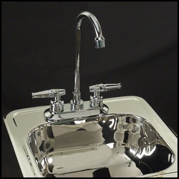 New Polished Stainless Steel Bar Sink with polished chrome finish faucet. Sink is 15" x 15" x 5 1/2" deep. The sink is Polished Stainless Steel and includes the drain strainer. The faucet is solid brass construction with a chrome finish. It is 4" center set - 10 1/4" High Spout - 1/2" IPS connections. All New and from Barclay Products. A great way to finish off your bar area or for anywhere you need an extra sink. Please contact us if you have any questions.